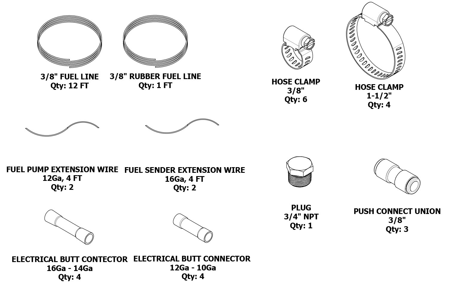 In this kit you will receive the electrical wire and connectors to extend the fuel pump wiring harness, the 3/8 Inch fuel line and push connect unions to extend the EVAP and fuel lines, and the fuel fill vent to connect back to the factory fuel fill. The fuel fill hose in your rig can be modified to work with the relocated tank. Instructions are provided to guide you through modifying your current fuel system.
