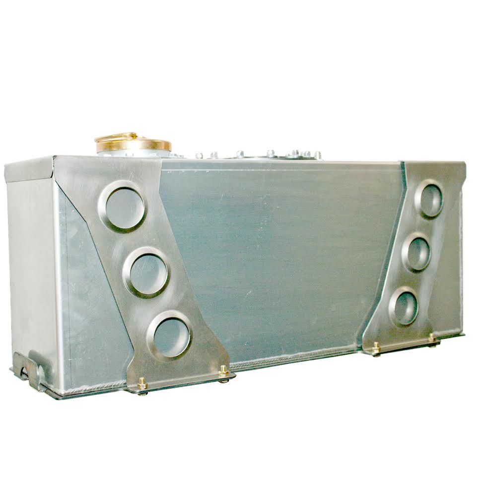 This design cost a little more to manufacture due to the large plate. It eliminates the sharp edges coming in contact with the bottom side of the fuel cell. This can be important in some situations where you may have body and/or chassis flex. The under tank plate is CNC Laser Cut from .125 inch high strength steel plate. You can weld your own mounting brackets to the bottom if needed or utilize the 8 bolt holes already in the part.