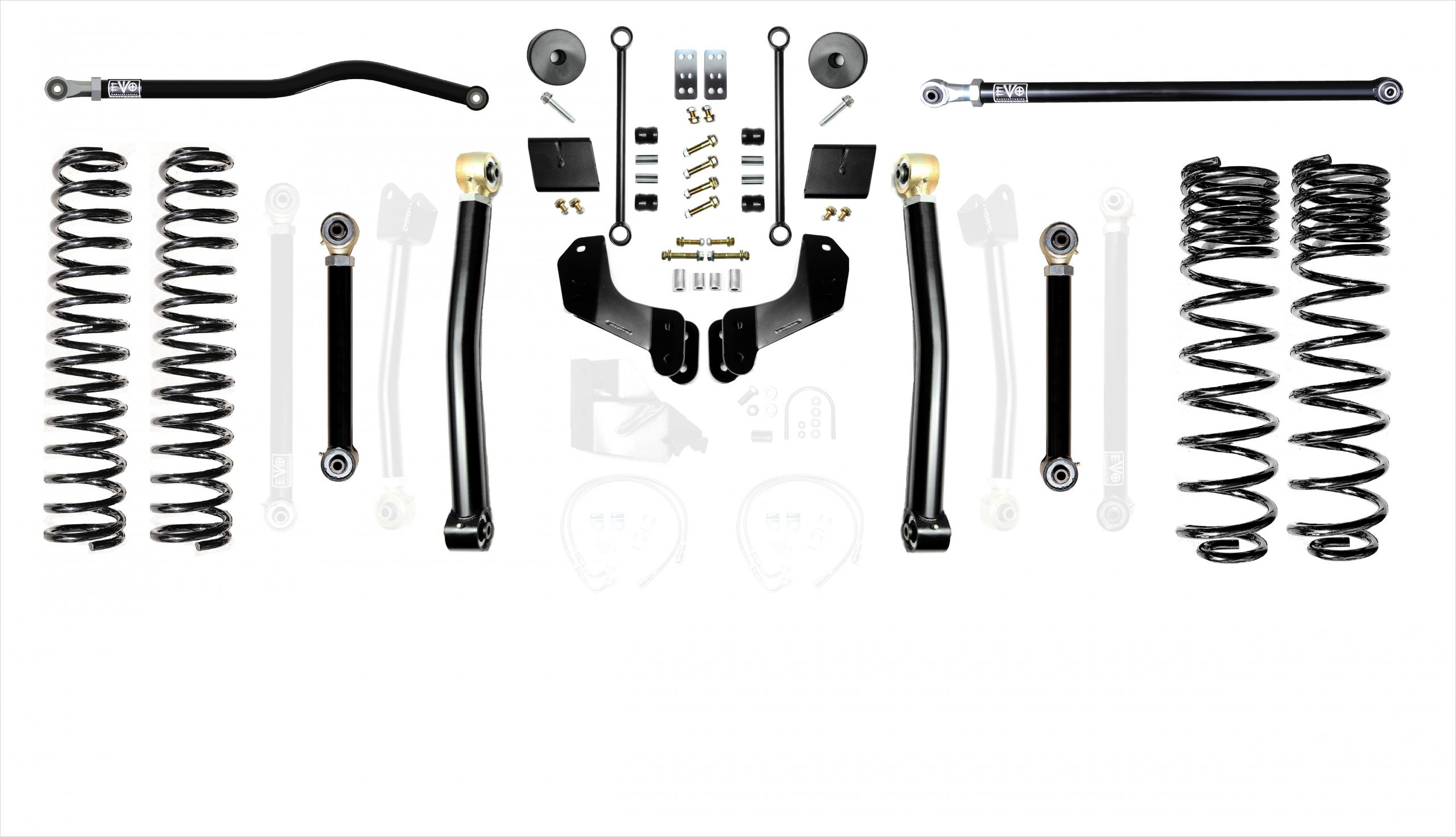 These kits allow for use of your choice of any aftermarket 2.5-5 inch lift shock or use of our EVO SPEC tuned 2.5 inch Remote Reservoir King Shocks. These kits come with a set of 2.5 inch lift springs specific to each corner which will keep the Jeep Gladiator JT level side to side.