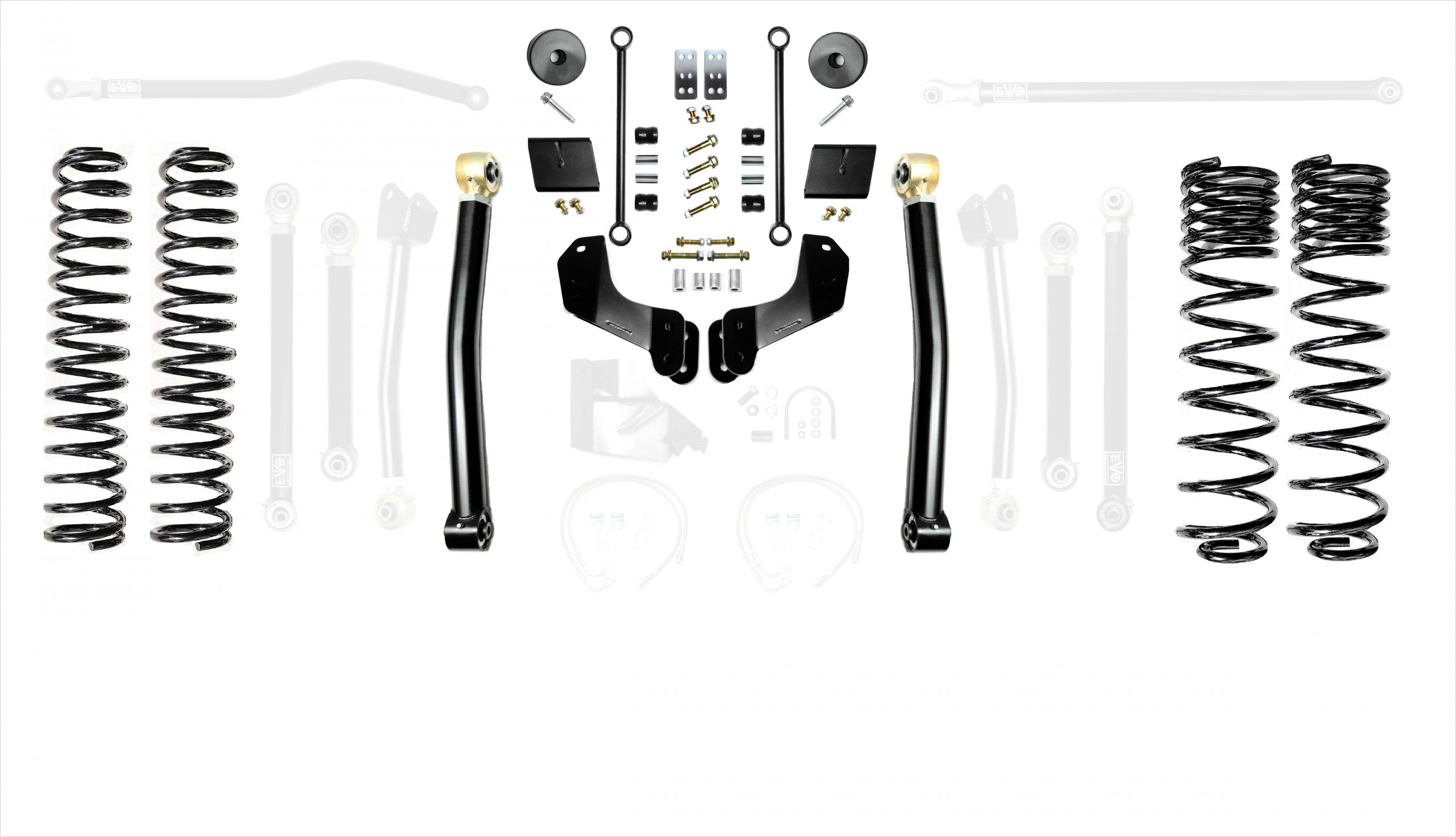 These kits allow for use of your choice of any aftermarket 2.5-5 inch lift shock or use of our EVO SPEC tuned 2.5 inch Remote Reservoir King Shocks. These kits come with a set of 2.5 inch lift springs specific to each corner which will keep the Jeep Gladiator JT level side to side.
