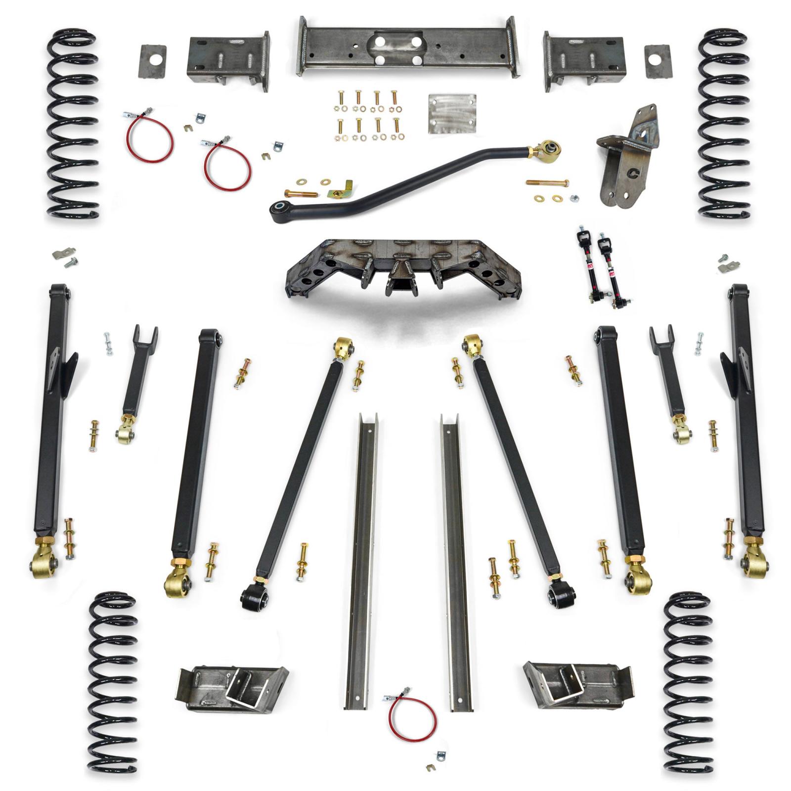 Kit includes, a front 3 piece cross member, unibody rails, rear frame brackets, rear 4 link truss, all 8 adjustable control arms with Hardware, front and rear coil springs, front and rear brake lines, front adjustable track bar and bracket, front sway bar disconnects and front spring retainers.