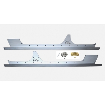 The EVO MFG Rock Skins are side armor plates are laser cut from 3/16 aluminum alloy and CNC bent. They are a bolt on installation with stainless steel hardware. These can be used with all factory Jeep sliders and steps as well as all aftermarket frame mounted rock sliders. The Rock Skins protection contours around stock and aftermarket fenders (factory mounting location).