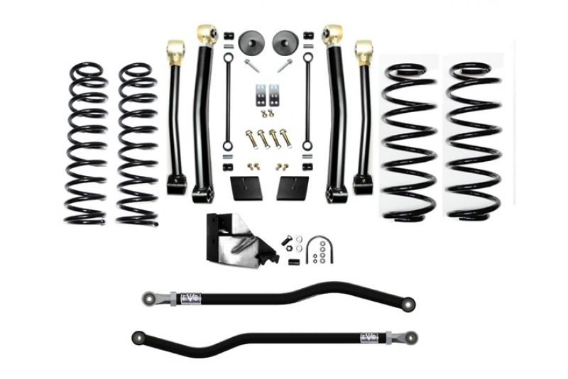 The EVO MFG 3.5 inch JL Enforcer Kits are easy to install using normal tools. No drilling or cutting (optional rear shock extensions require one minor drill). They require no driveshaft or exhaust modifications (your shock choice may require this, contact manufacturer to be sure). Simple Bolt on installation.