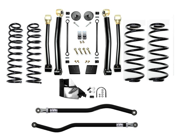 These kits come with a set of 4.5 Inch lift springs specific to each corner which will keep the Jeep Wrangler JL more level side to side. EVO MFG JL Enforcer kits are available in multiple configurations to suit your needs and budget and are upgradable down the road. The EVO MFG 4.5 Inch JL Enforcer Kits are easy to install using normal tools. No drilling or cutting (optional rear shock extensions require one minor drill). They require no driveshaft or exhaust modifications (your shock choice may require this, contact manufacturer to be sure). Simple Bolt on installation.