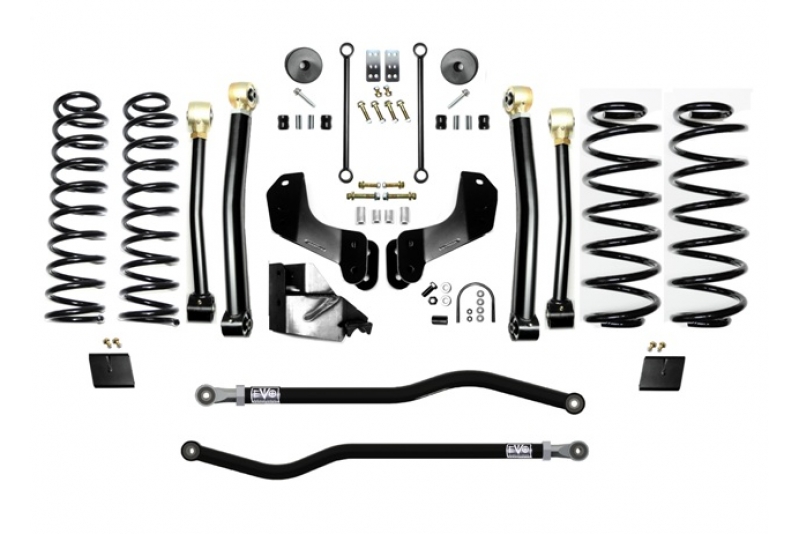 These kits come with a set of 4.5 Inch lift springs specific to each corner which will keep the Jeep Wrangler JL level side to side. EVO MFG JL Enforcer kits are available in multiple configurations to suit your needs and budget and are upgradable down the road. 4.5 Inch kits come with raised rear trackbar track to center axle and correct roll center for imProved handling.