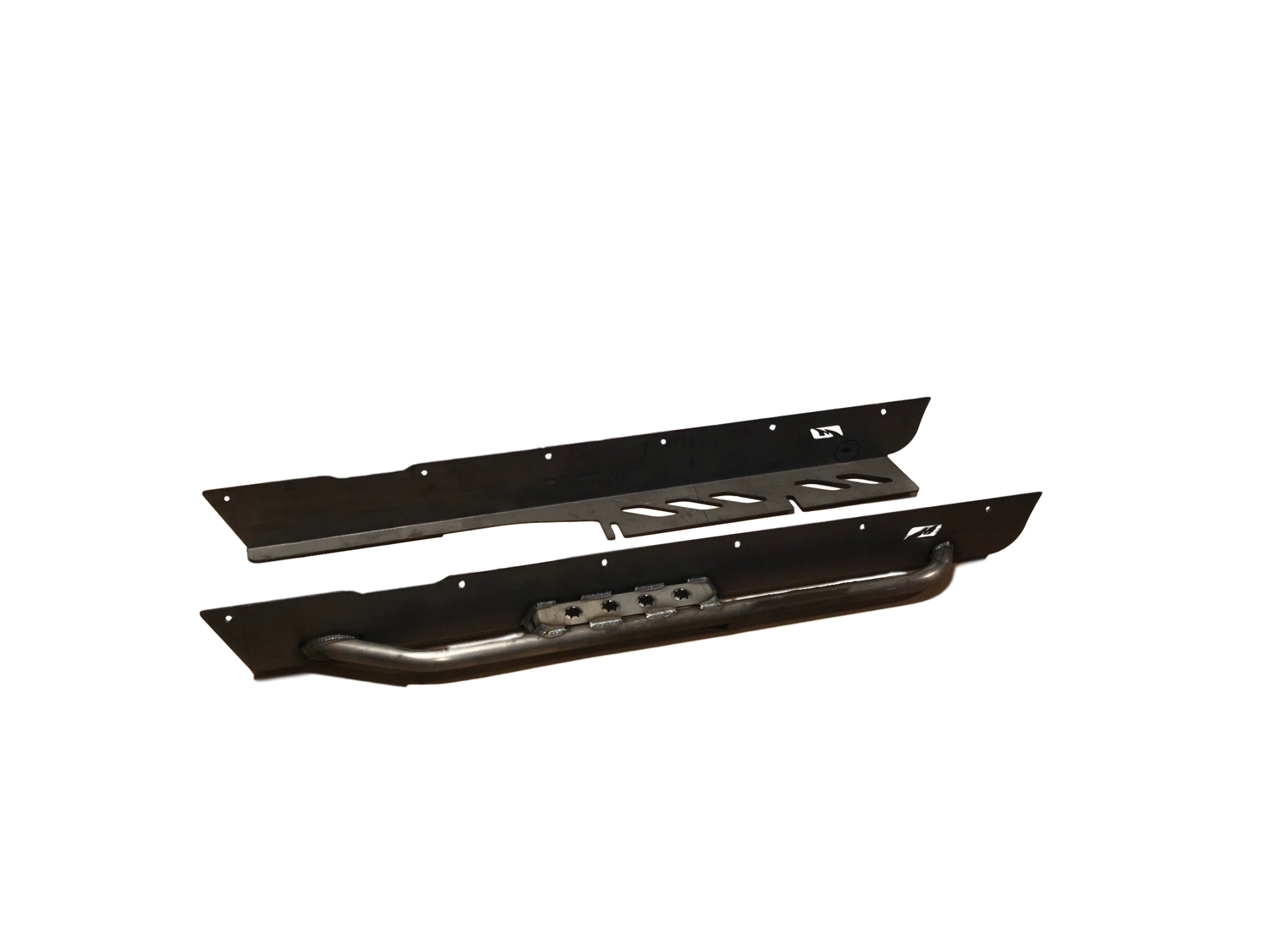 The Motobilt Jeep LJ full length rocker guards with step extend from the front fender all the way to the rear wheel well opening are in-house laser cut CNC formed from 3/16 inch thick high strength steel plate.