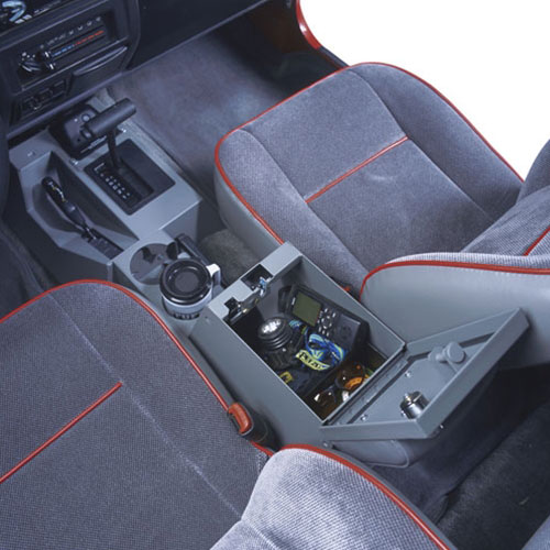 This high security 16 gauge steel console enjoys all the same features as the TJ Stereo Security Console except it incorporates two oversized drink holders in place of the separate stereo compartment. The front drink holders, padded armrest, and front console for levers are included in this model. The new sleek, custom fit design matches the TJ's refined interior and offers more interior storage.