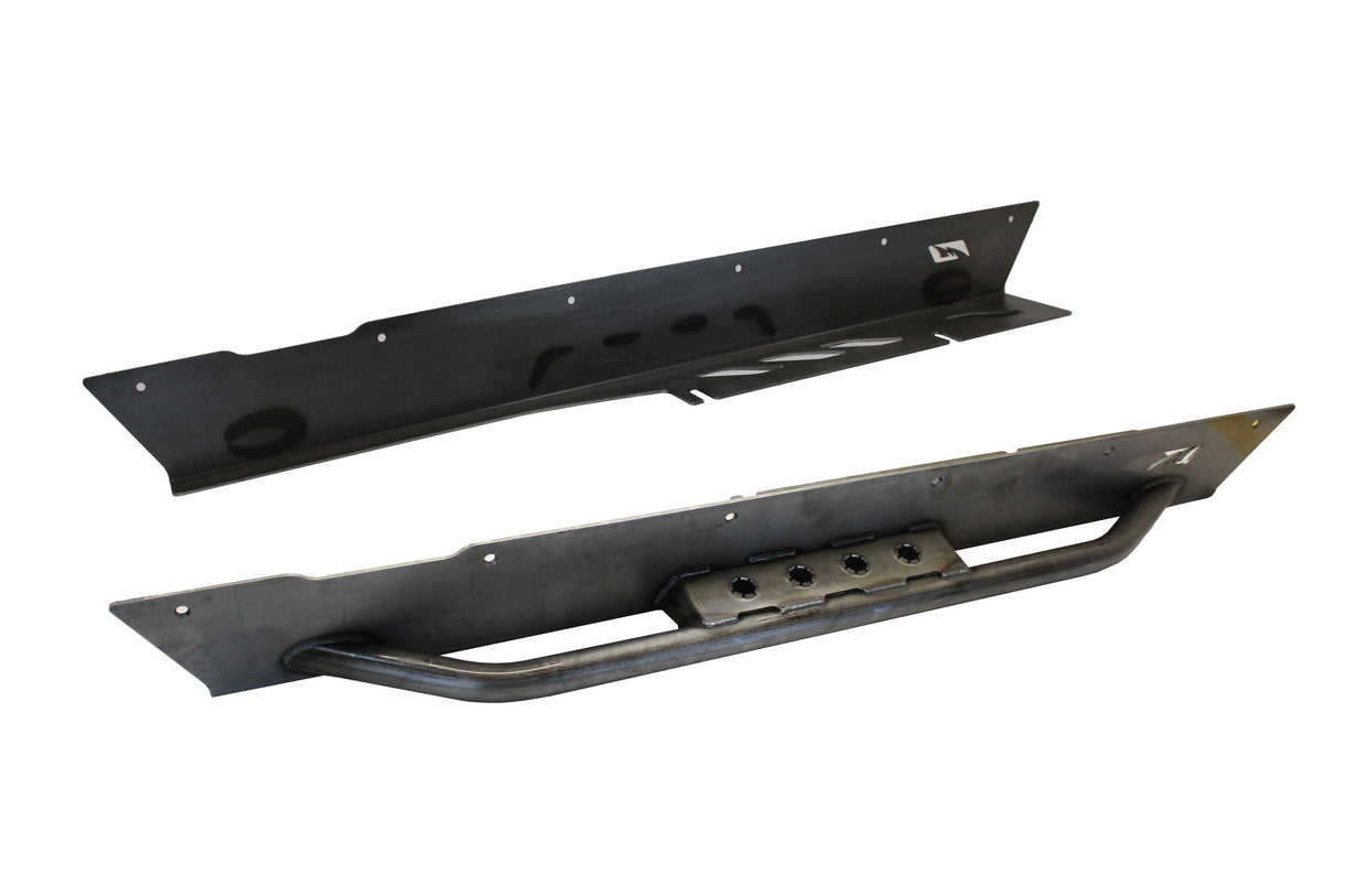 The American Made Motobilt Jeep LJ Unlimited rocker guards with stock flares are made out of 3/16 inch thick steel plate. These guards will work with your factory Jeep fender flares. They are laser cut and cnc formed in house at Motobilt. The mounting hardware is provided and the mounting holes are countersunk for a smooth finish when installed.
