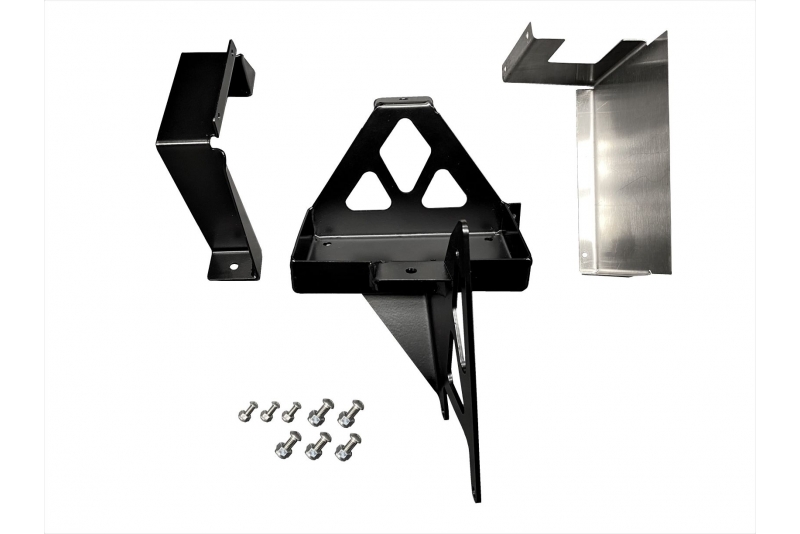 2018-2020 Jeep Wrangler JL/JLU Diesel Accessory battery relocate for use with JL/JLU Diesels euipped with EVO MFG Bolt on Front Coilover or Front Double Throwdown. Powdercoated Black with stainless Heat Shield.