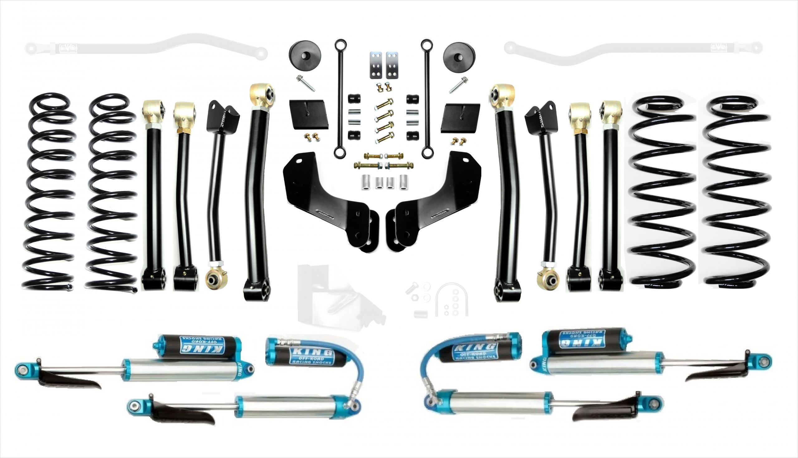 Stage 4 kits includes stages 1 components with all 8 EVO MFG Enforcer control arms for full front and rear axle adjustments.