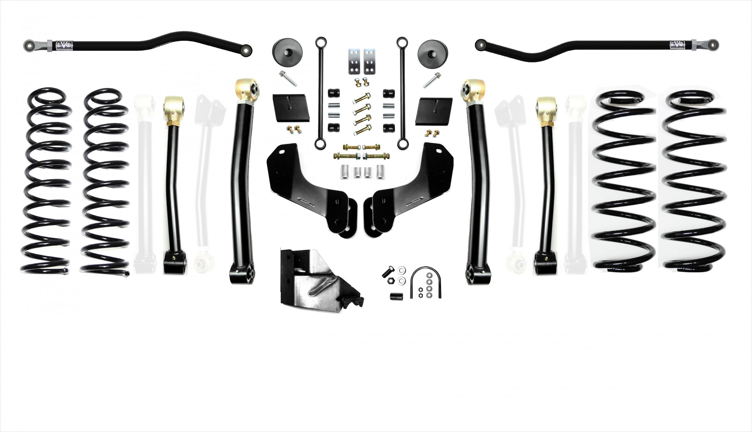 Also, in the use of Overland Drop Brackets we are able to engineer more performance into the front suspension to improve braking and driveline angles through suspension cycle. Both kits drive very well, the Overland Kits are better suited for less hard off-road crawling and more light off road and on road use. The EVO MFG 4.5 inch JL Enforcer Kits are easy to install using normal tools. No drilling or cutting (optional rear shock extensions require one minor drill). They require no driveshaft or exhaust modifications (your shock choice may require this, contact manufacturer to be sure). Simple Bolt on installation.