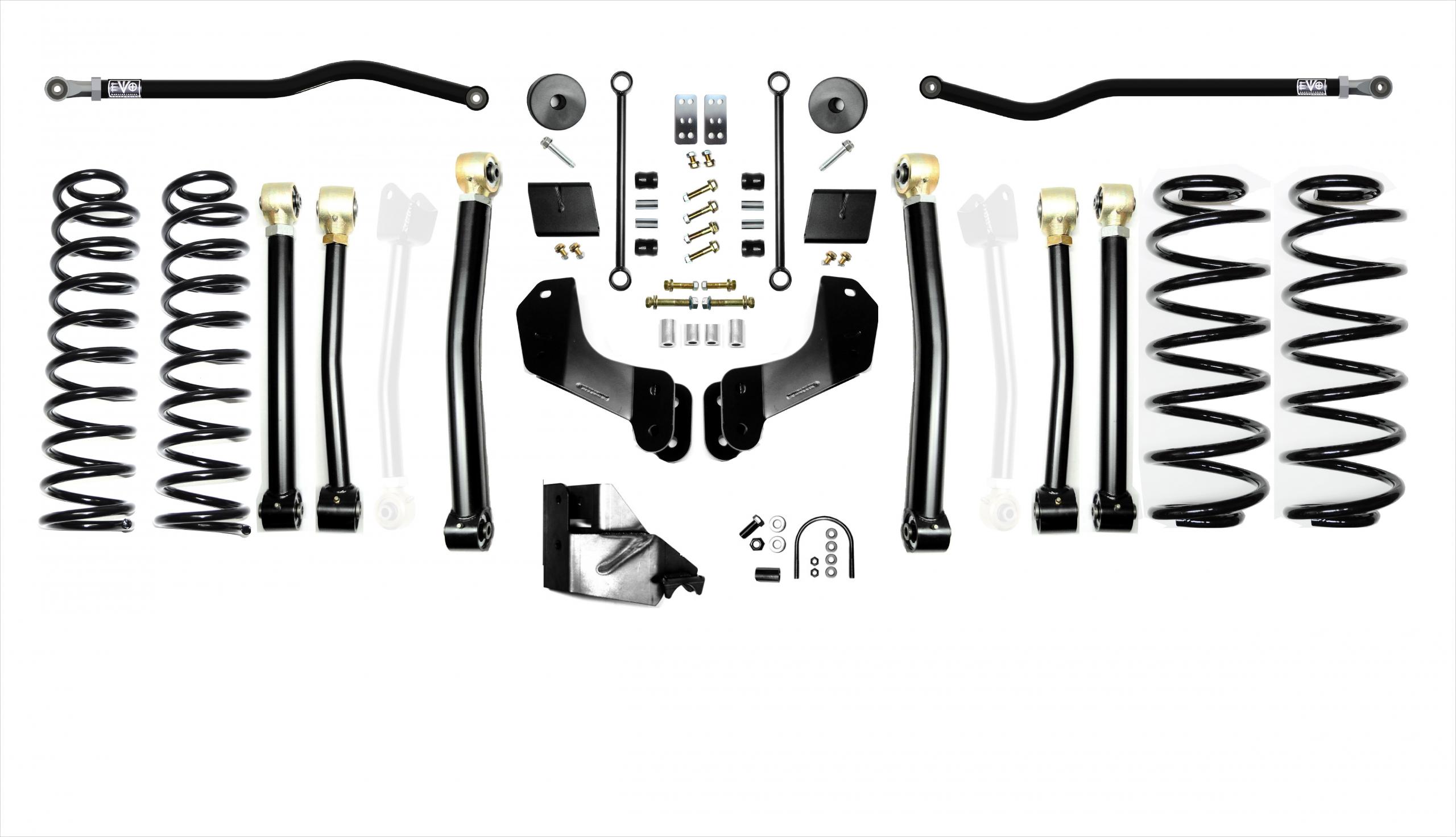 • Stage 2 kits includes stage 1 components as well as EVO MFG Enforcer JL Front Lower Adjustable Control Arms to allow for caster adjustments.