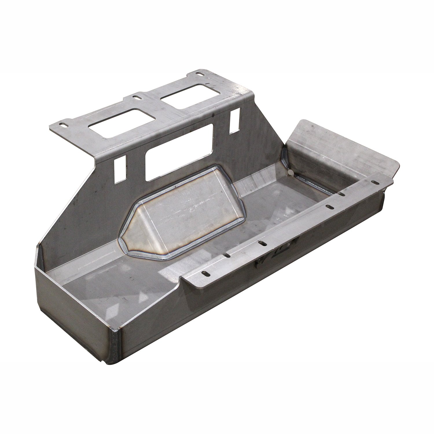 The skid plate portion of the assembly is also laser cut and CNC formed here in house at Motobilt. It is constructed of 3/16 inch thick steel plate and features the Motobilt logo on the rear face. The tank is shipped bare aluminum. The skid plate and hold down straps for the tank are shipped bare steel and do require painting or powder coating before install. The kit also includes bolt plates to hold down the factory sending unit.
