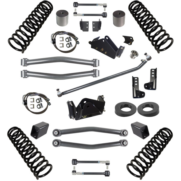 Synergy Jeep JK 3 Inch Lift Stage 2 Suspension System is the first to include lower control arms and is the first system you'll be comfortable dragging over rocks. It includes all the components from the Stage 1.5 System with the addition of Heavy Duty Fixed Length Lower Control Arms (8046 8047) front/rear to correct caster and increase durability off road. These lower control arms are designed to take abuse and are fixed length for low maintenance and worry free wheeling. This system will fit 35 inch tires with stock fenders or 37 inch tires with high fenders.