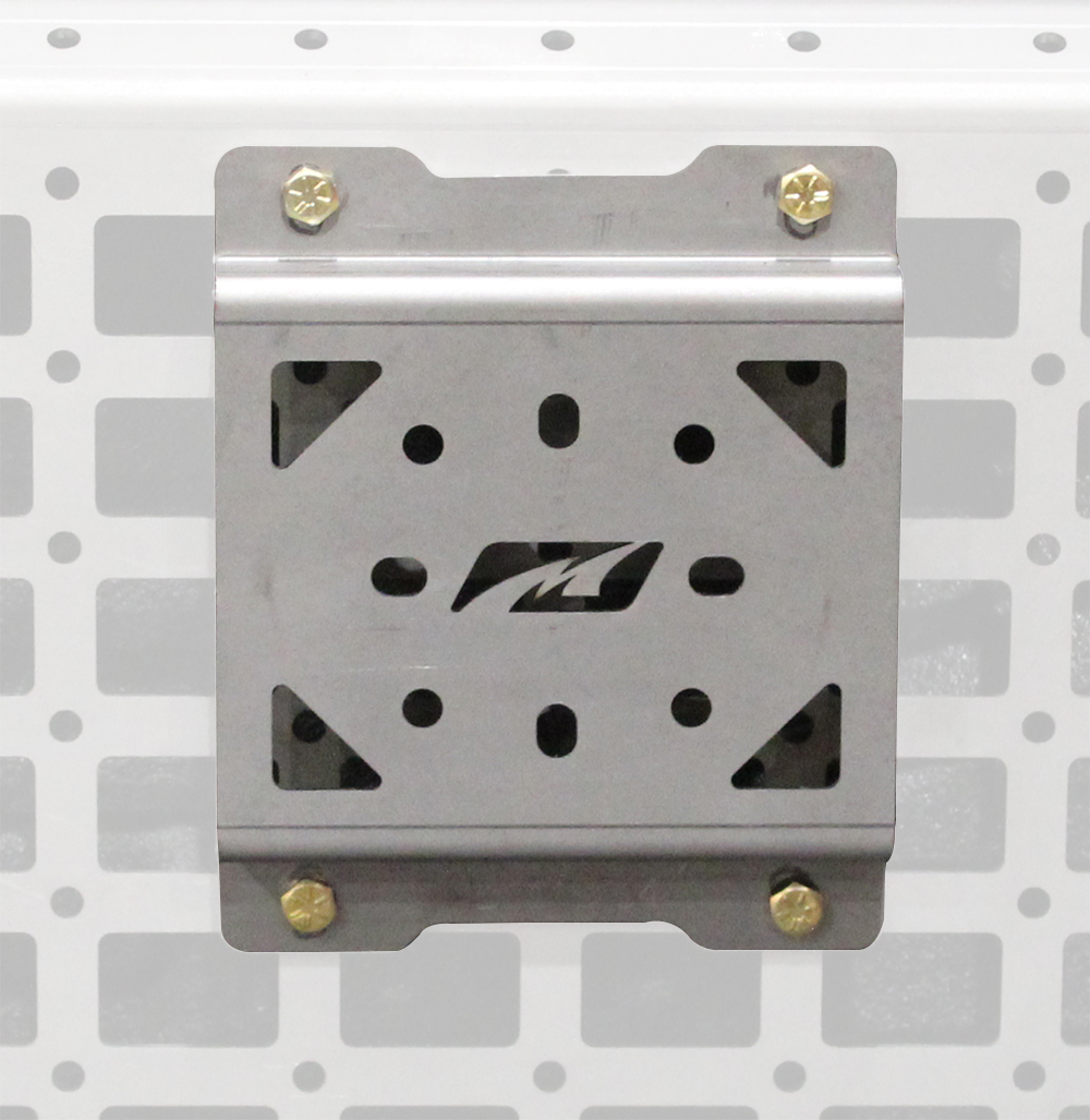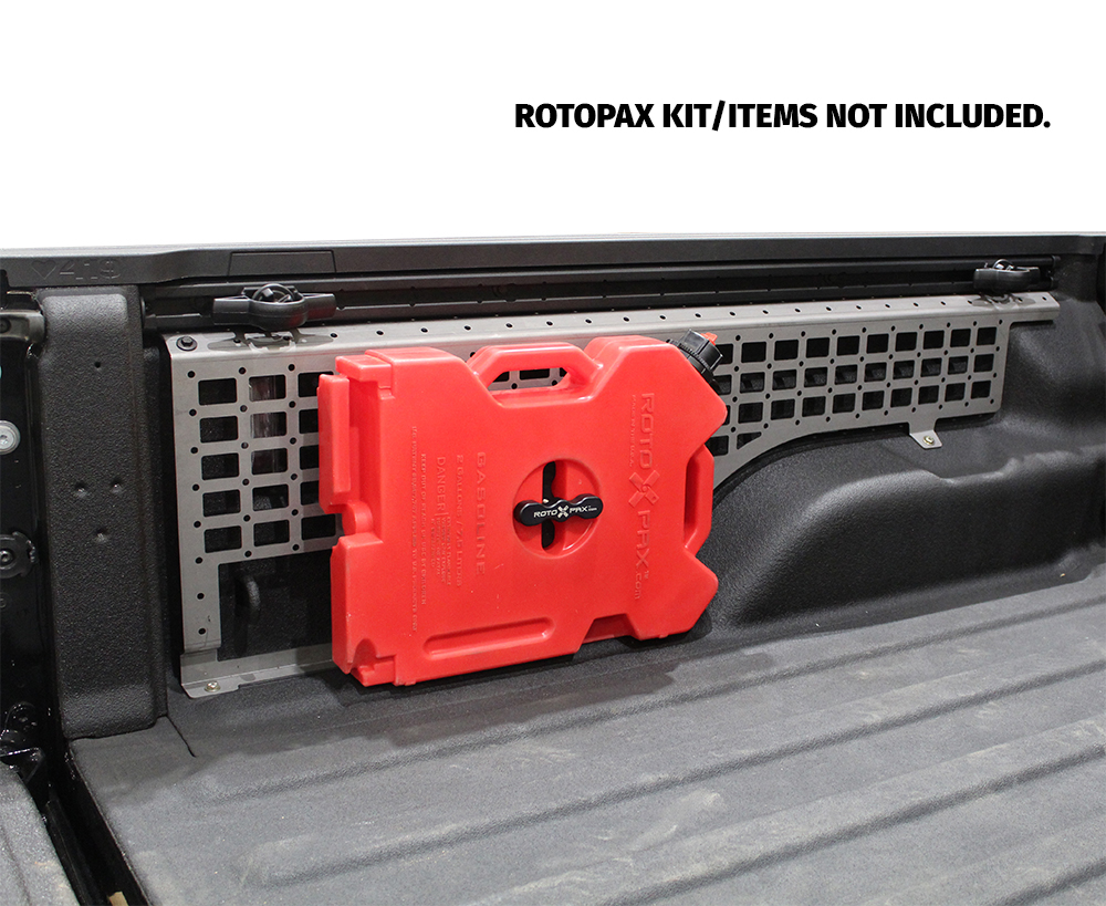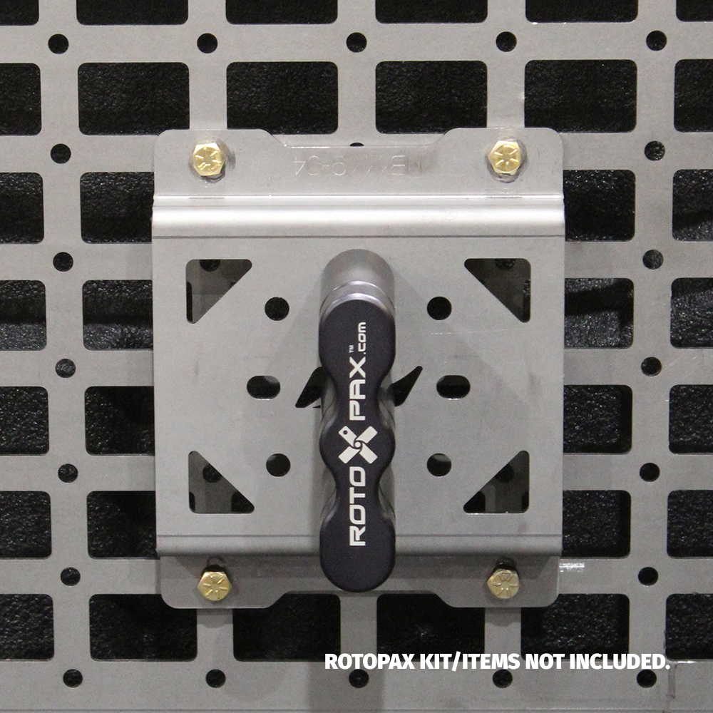 This heavy duty mount was designed to allow you to quickly and securely mount a Rotopax product to our Motobilt MB1119 Gladiator MOLLE Bed Rack System, however, it can also be very useful to safely mount your Rotopax products to any flat vertical surface like the inside of a cargo trailer, side of a truck storage box or on any interior or exterior wall.