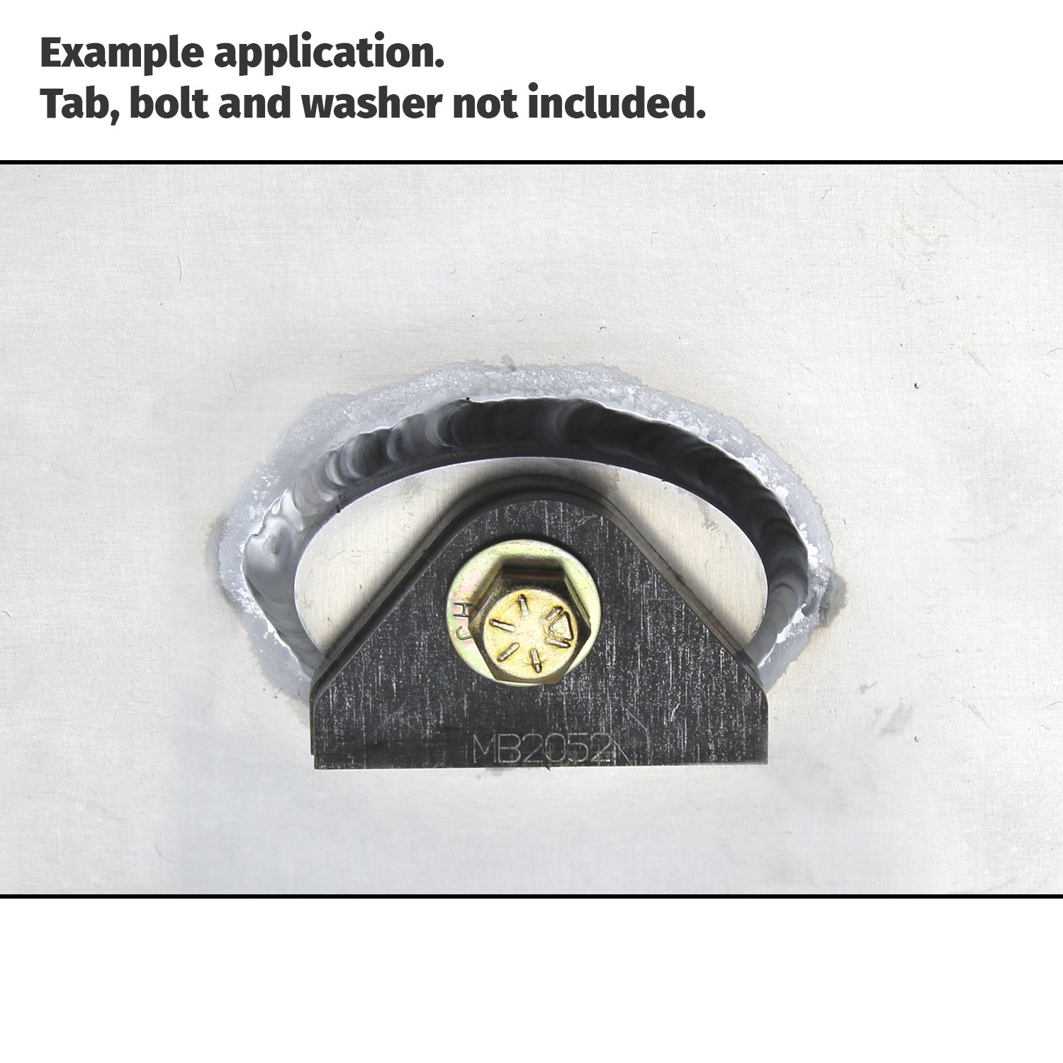 We have included a sample pic showing a fixation welded to 11GA aluminum with a sample tab bolted in place. We do not include bolt or tabs because of the many different applications this aluminum fixation can be used in.