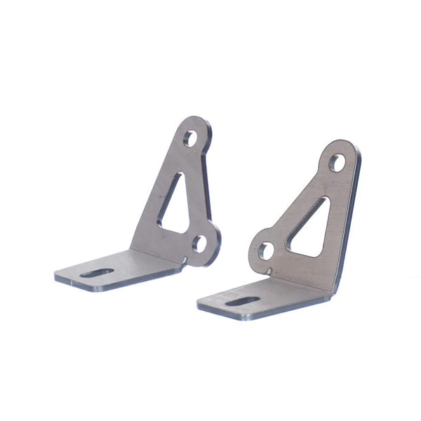 The kit ships with a left and right side bracket including 4 longer bolts for installation. The brackets are shipped bare steel. The brackets are designed with a 3/8 inch wide slotted hole to allow for the light to be adjusted.