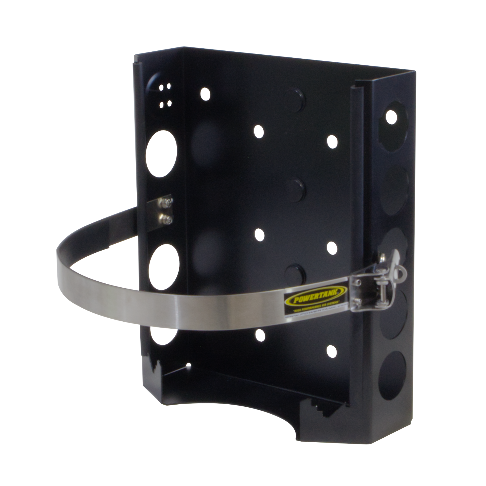 The frame is powdercoated satin black with rubber trim and bumpers at all major contact areas of the tank. The strap is stainless steel and features an adjustable quick release latch. All rivets are stainless steel for a sure, corrosion-free connection. The inside of the strap is lined with a rubber padding to protect your tank. The latch does allow a lock to secure your tank from theft.