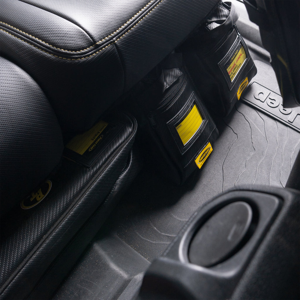 Under-Seat-Storage Kit! These Pritchett Box Bags and Cliffhanger Wedge Bags fit perfectly under the rear seats of your four door Wrangler, Gladiator, or Ford Bronco. Card window on front tells you whats inside, while the yellow EZ-Find Interior helps you find it!