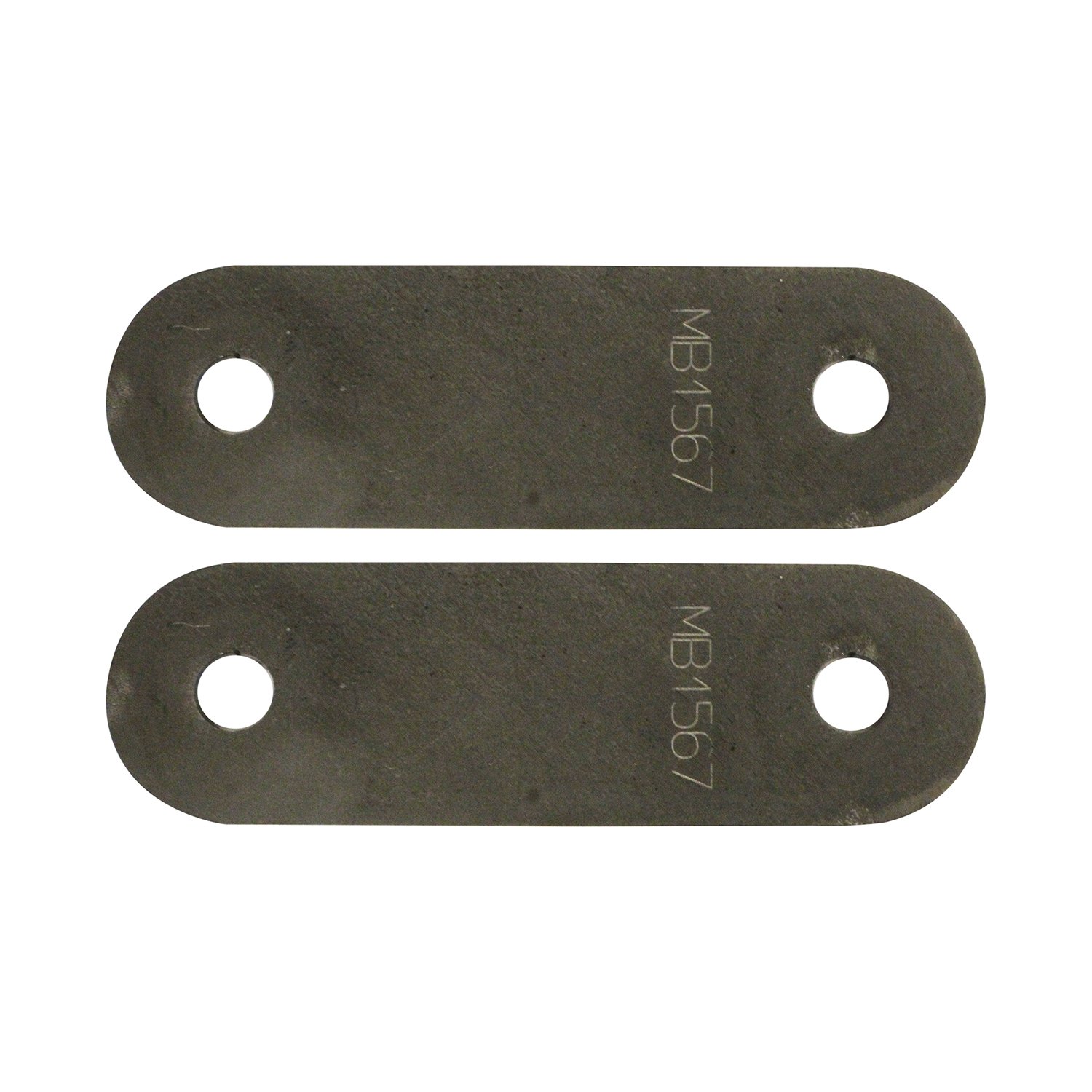 The Motobilt shackle plates are made out of 3/8 inch thick steel plate that is cnc laser cut. Each shackle plate uses 1/2 inch holes. The shackle plates are laser cut and shipped raw steel. We also have a 4 Inch version with a center bolt hole in both a straight and boomerang versions.