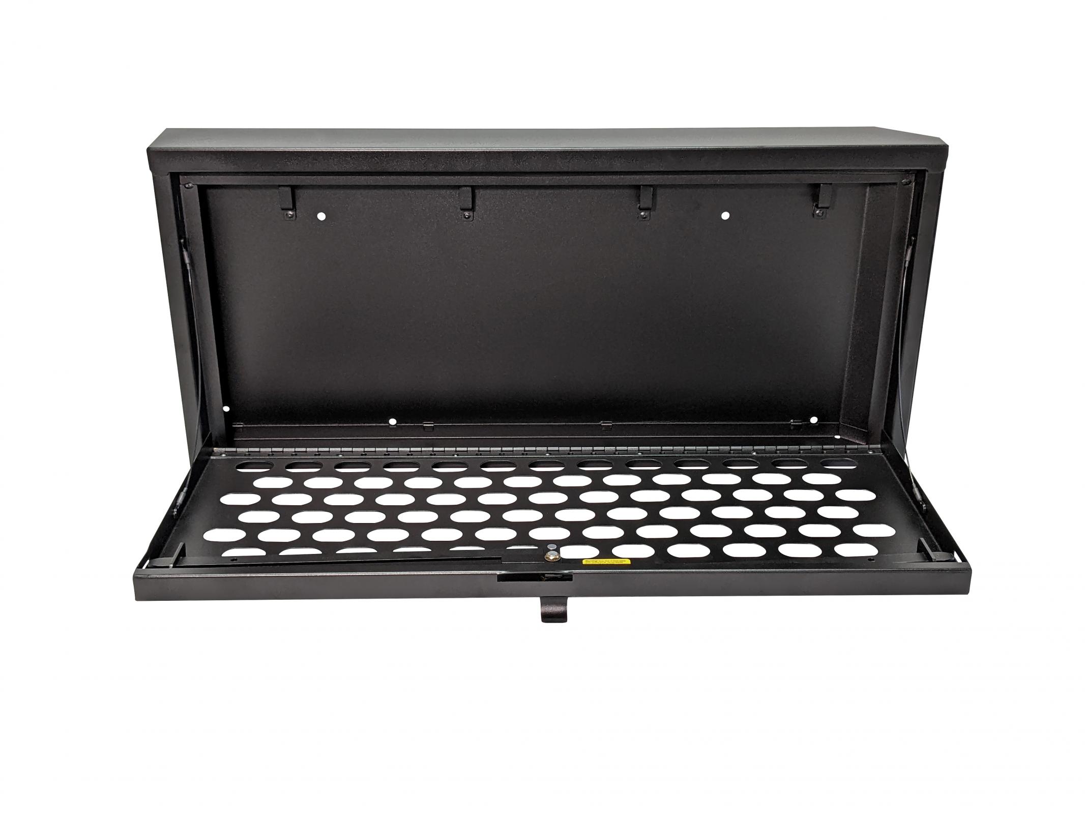 This heavy duty, high security lock box mounts on the inside of the Jeep JL tailgate providing ample secure storage for tools and other gear. The door folds down creating a work table for cooking or quick sorting and access of the lock box contents Supports up to 40 lbs.. The Tailgate Lock Box comes equipped with 2 removable shelves for organization of smaller items. The entire Tuffy JL Tailgate Lock Box is constructed using welded steel, heavy duty fasteners and is covered with a durable textured powder coat finish. The JL Tailgate Lock Box installs to the JL Tailgate Rail mounts using standard hand tools with or without an OEM hardtop. Featuring Tuffy's Pry-Guard Locking System with a 10-tumbler double bitted security lock with built in weather seals. We engineered it to work seamlessly with the Tuffy JL Tailgate Enclosure to double down on your secure cargo storage options.